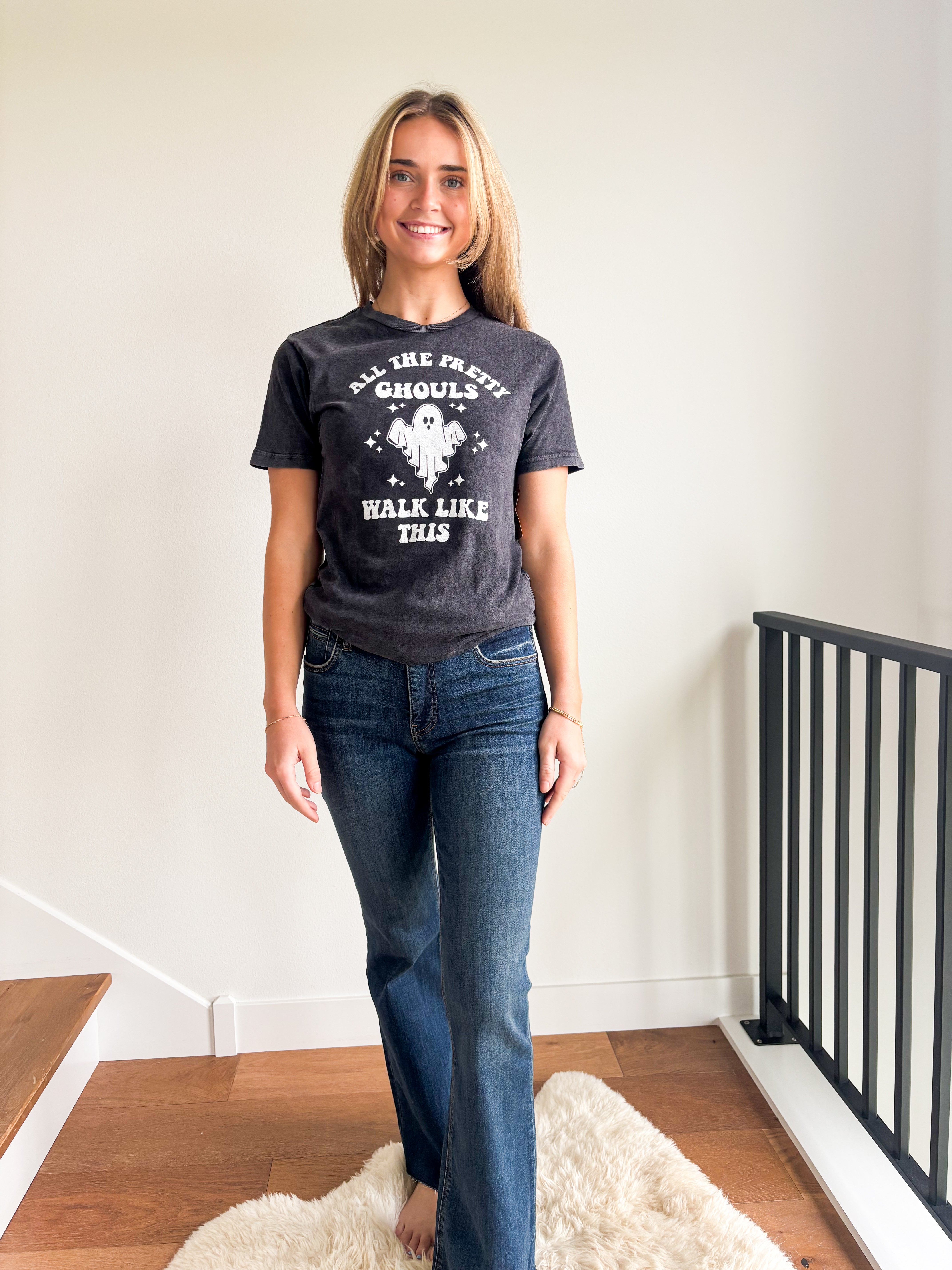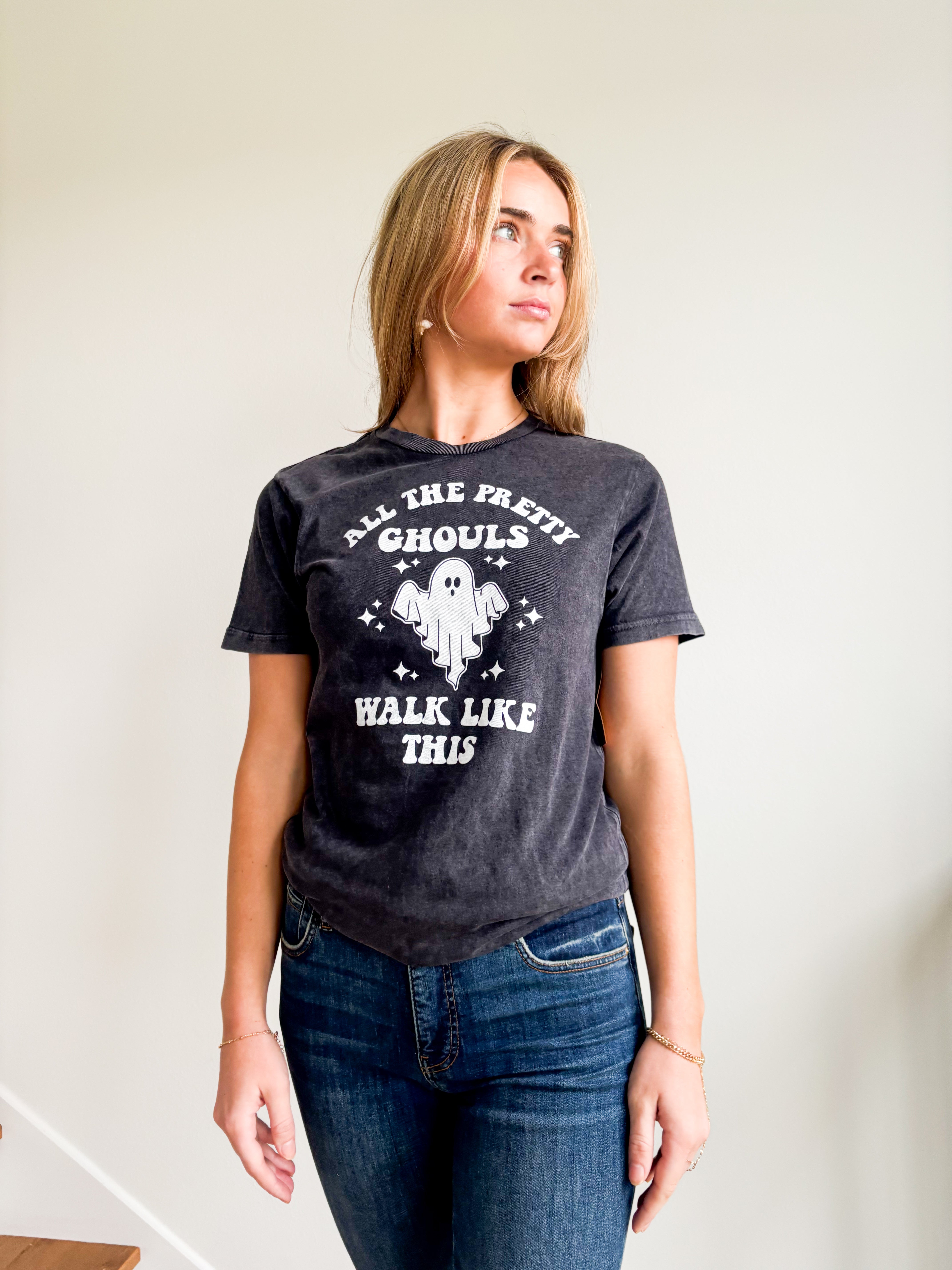 STYLE: Stay stylish and spooky this fall with our Ghost Graphic Tee. Featuring the perfect graphic with the phrase "All the pretty ghouls walk like this", this tee is a must-have for any Halloween lover. Made with high-quality material and a comfortable fit, this tee is perfect for any casual occasion.