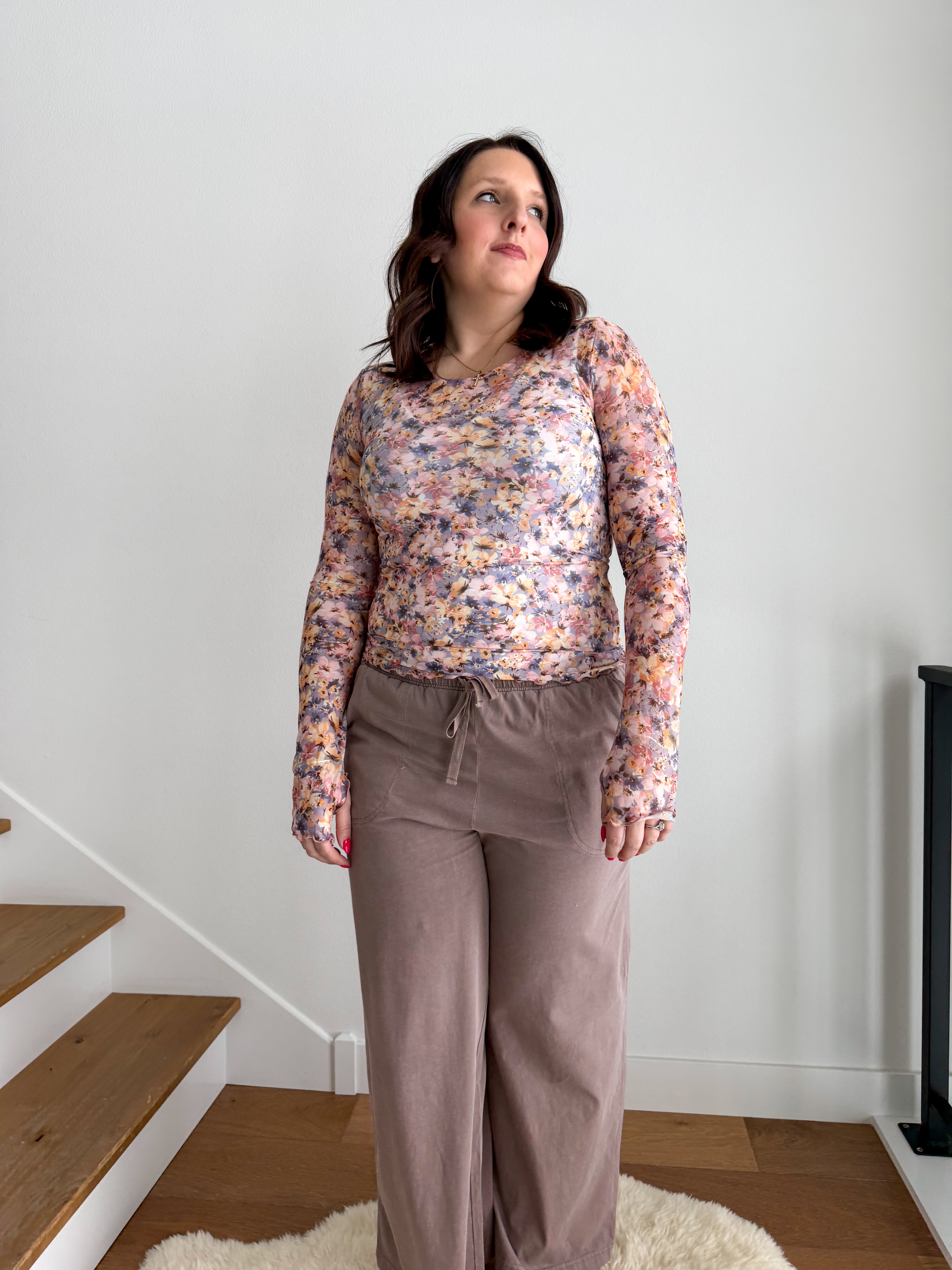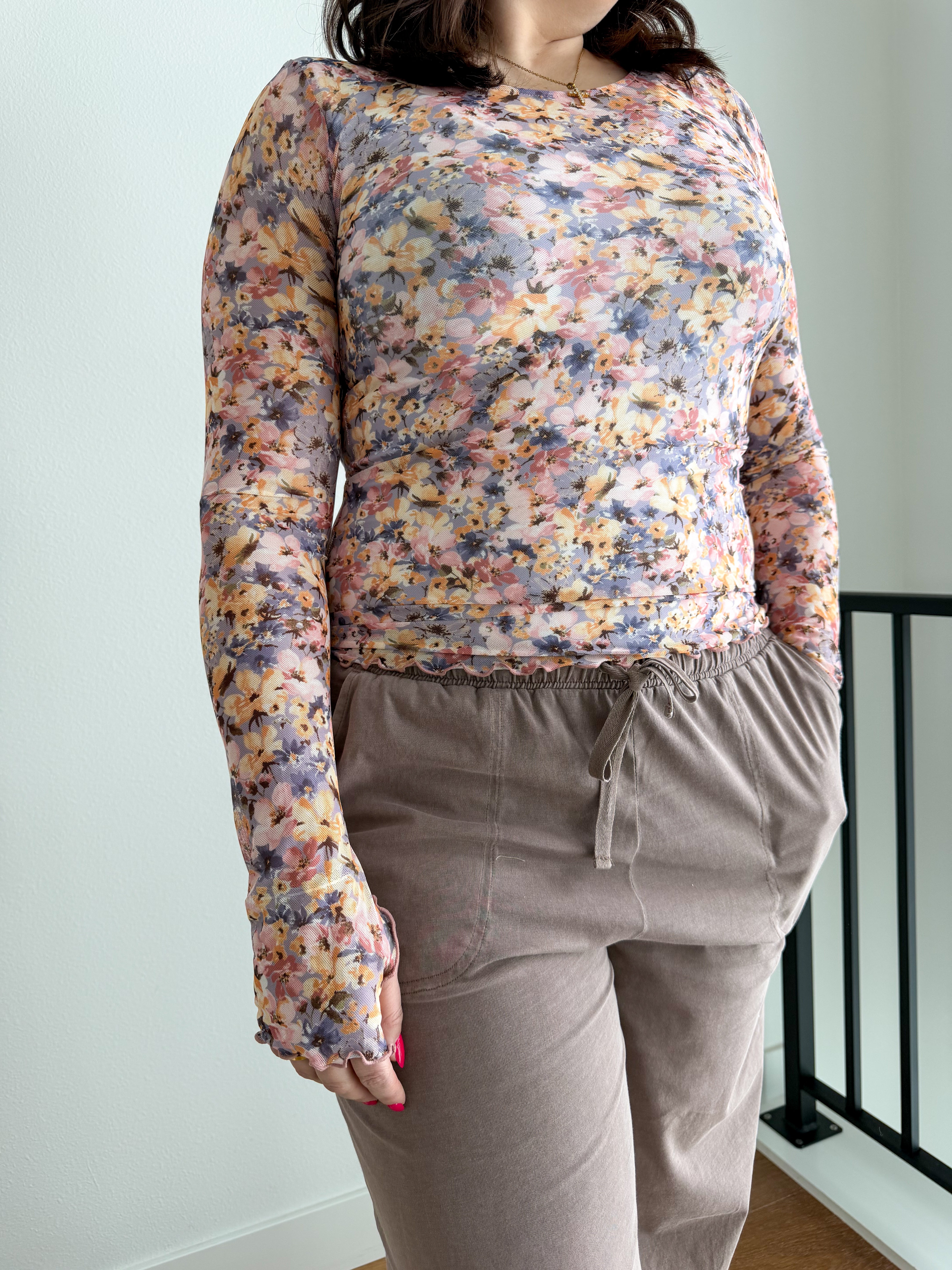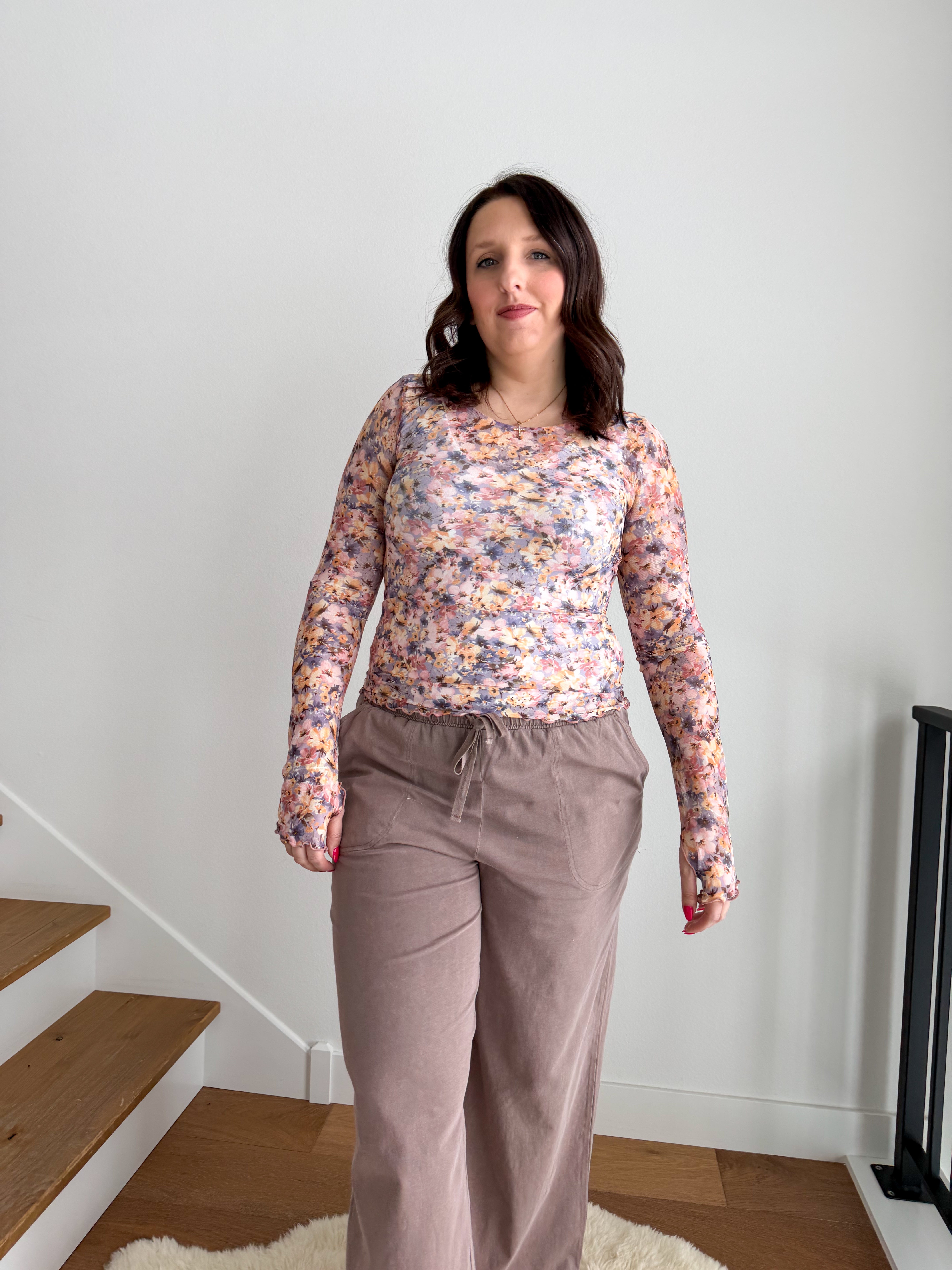 STYLE: This floral mesh top features an elegant botanical design that works as both a statement piece and a versatile layering essential. The breathable mesh fabric provides comfort and visual interest, whether worn independently to highlight the print or layered strategically under vests and graphic tees for curated depth.