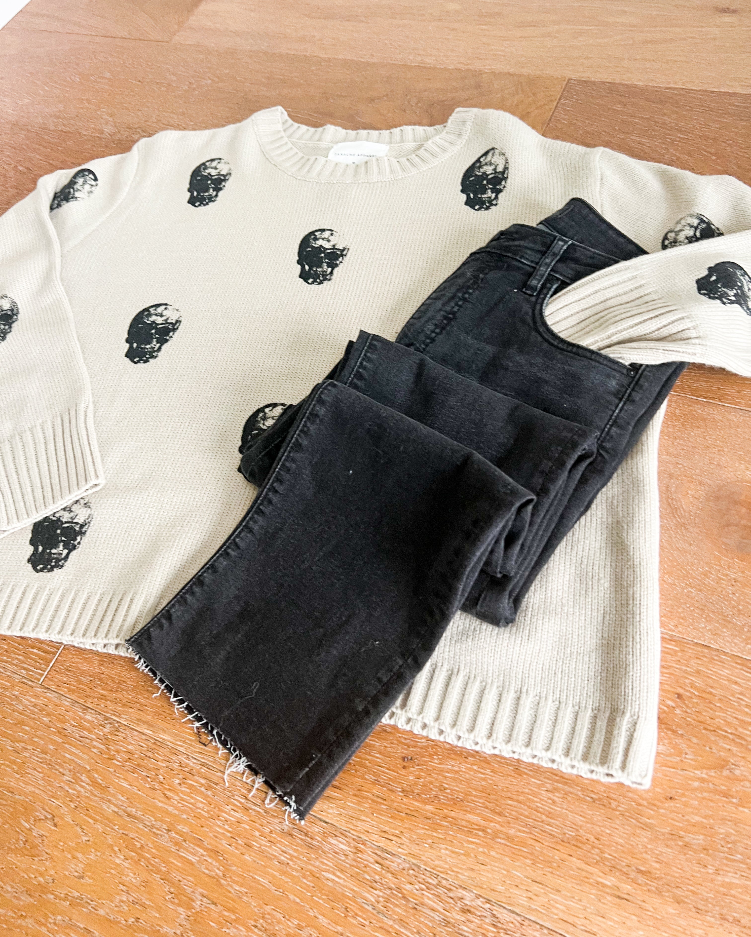 STYLE: Stay stylish and cozy in this Skull Sweater. Crafted from tan knit acrylic, this crewneck pullover features an eye-catching skull pattern. Show off your edgy style and keep warm at the same time.